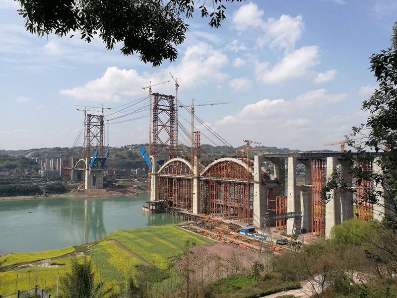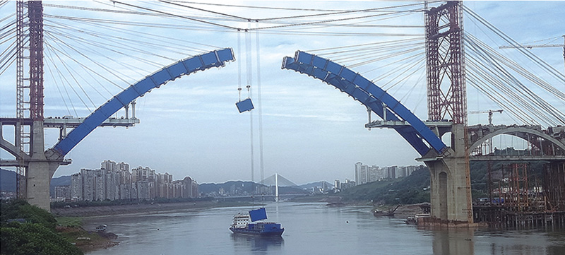 該橋?yàn)閲?guó)內(nèi)跨徑大的中承式公鐵兩用鋼箱拱橋,主跨336米,采用400噸纜索起重機(jī)吊裝施工,主拱于2017年6月合龍,合龍精度4毫米。