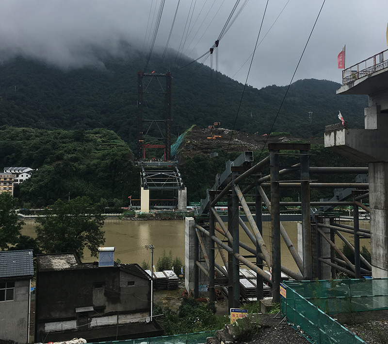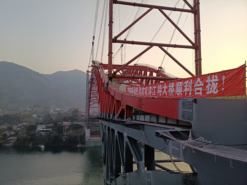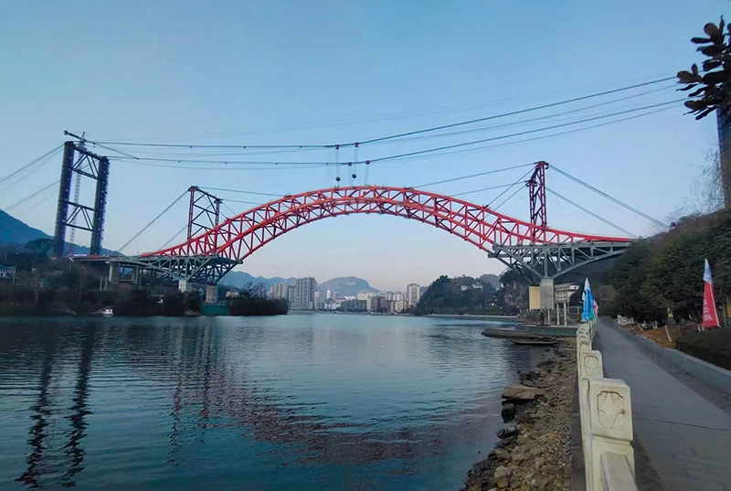 湖北長(zhǎng)陽(yáng)清江特大橋全長(zhǎng)354.8m,主橋?yàn)?20m飛燕式鋼桁架系桿拱橋,采用2*80噸纜索吊機(jī)安裝,主拱于2021年1月14日合龍。