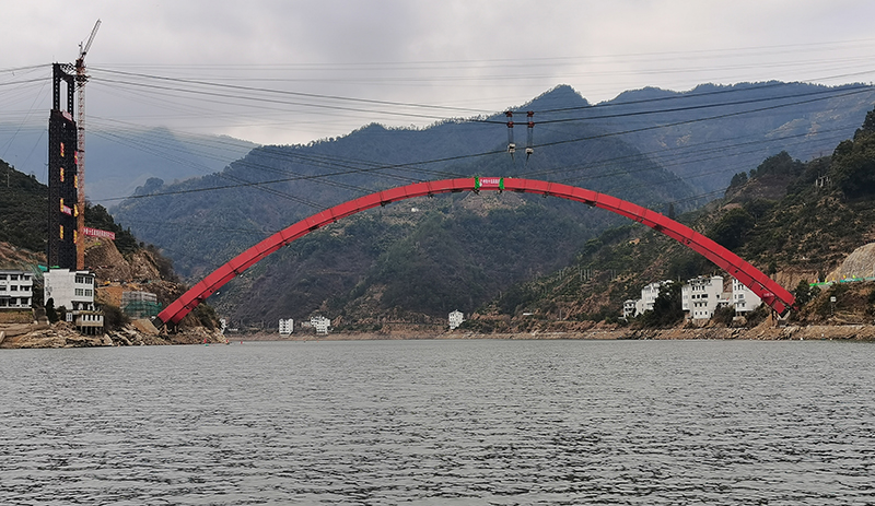 新安江大橋是目前安徽省內(nèi)最大的單栱中承式鋼箱提籃拱橋,大橋位于歙縣街口鎮(zhèn)和新溪口鄉(xiāng)境內(nèi),全長279米,主跨257.2米,采用180噸纜索吊進行安裝,主拱于2021年1月26日合龍。