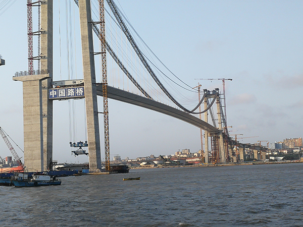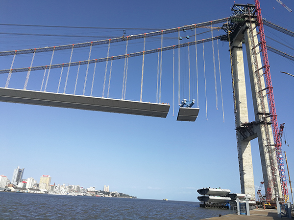該橋為鋼箱梁懸索橋,主跨680米,全長3034米,采用2×125噸纜索起重機(jī)及旋轉(zhuǎn)吊鉤,25天完成橋面鋼梁安裝,該橋建成后成為非洲第一大懸索橋。